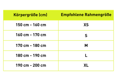 Unsere Tabelle gibt dir eine erste, unverbindliche Einschätzung, welche Rahmengröße für dich passen könnte – basierend auf deiner Körpergröße. Sie soll dir helfen, ein Gefühl dafür zu bekommen, ob du eher zu XS oder XL tendierst.